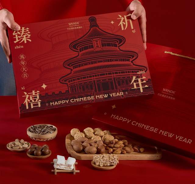 对于追求生活品质的年轻客群而言,“好看”是触发购买欲的第一道门槛。万达生活方式品牌(万达颐华酒店、万达美华酒店和万达悦华酒店)此次的年货礼盒,将设计美学提升至战略高度。以“锦食岁欢”礼盒为例,其外盒采用双层八角盒型,并匠心独运地设计了以“鱼”为主要形状的镂空视窗,直接呼应内配的“年糕鱼”,堪称“开箱即彩蛋”。工艺上,运用了专色印刷、七彩UV、logo烫金及内裱红色艺术纸等精湛技术,让礼盒本身就如同一件精致的艺术品。而“祈年臻禧”坚果礼盒,则通过烫金、局部UV等工艺,在简约中透出高级感。这种不吝成本的包装投入,精准击中了年轻消费者对“出片率”和“社交货币”属性的需求——一份能引发朋友圈点赞的礼物,其情感价值已被倍数放大。