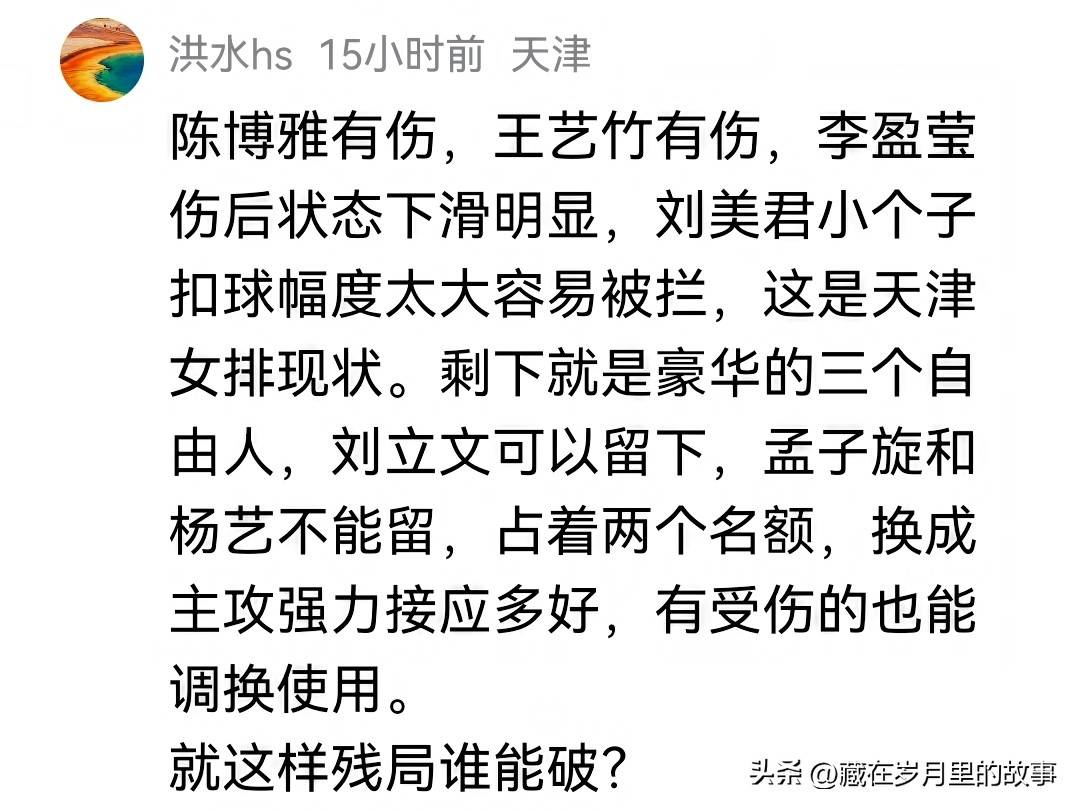 如今的天津女排,卸下了卫冕冠军的包袱,问题也暴露无遗。球迷们的批评或许刺耳,但往往一针见血,苦口良药利于病。正如网名“洪水”的天津球迷所言,陈博雅带伤,王艺竹带伤,李盈莹术后状态下滑,刘美君身高不足容易被拦,这便是天津女排眼下的困境。