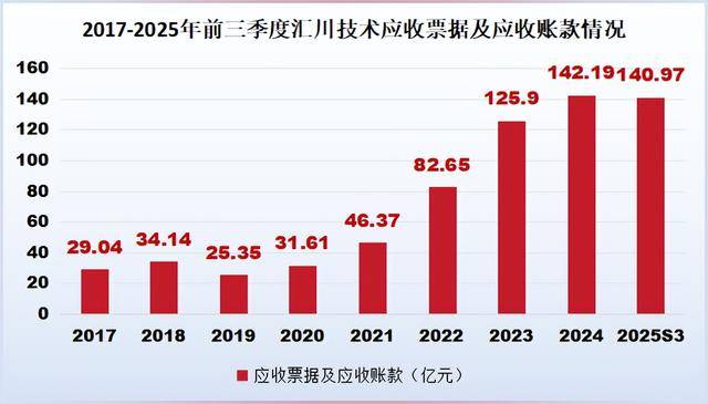 更让人担忧的是现金流。由于下游客户(尤其是车企)资金紧张,汇川的应收票据及账款从2017年的29亿,飙升至2025年三季度的近141亿,占当期营收比例高达45%。