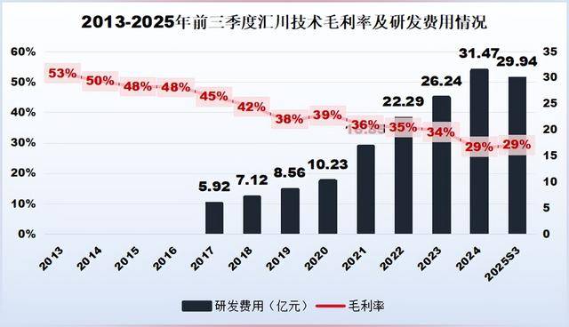 2013年汇川技术整体毛利率高达53%,净利润率超过30%,是一家不折不扣的高利润技术公司。2025年前三季度整体毛利率已下滑至29%,近乎腰斩。