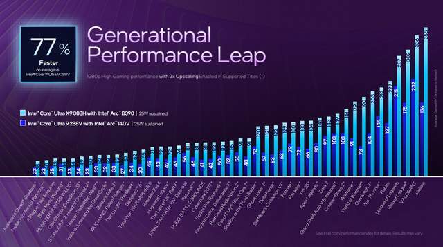 根据官方分享的数据,同样是《赛博朋克2077》光追拉满,英特尔X9 388H的Arc B390核显开了XeSS3+4倍帧生成后,帧率直接干到146,是AMD HX 370的4倍多!